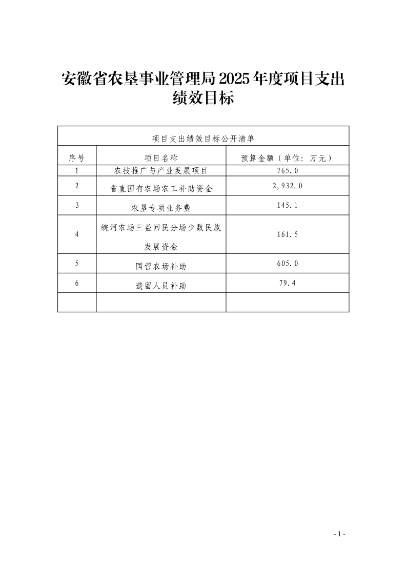 安徽省农垦事业管理局2025年度项目支出绩效目标