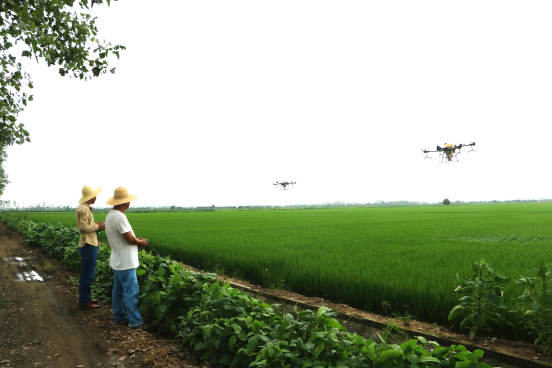 近日,在安徽农垦集团皖河农场三益分场的“千亩方”示范田里,两台无人机来回穿梭为水稻施肥,助实该集团实现粮食增产增效。